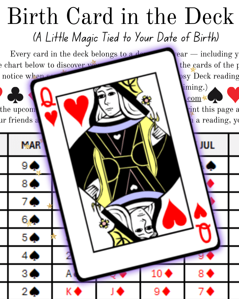 The Ace of Hearts is the only card in the deck that has only one date of birth in the calendar. The 13 cards in the suit of Hearts are always about new Babies, Love, Family, Faith, Home, Art, Music, and everything that is warm and cozy.
