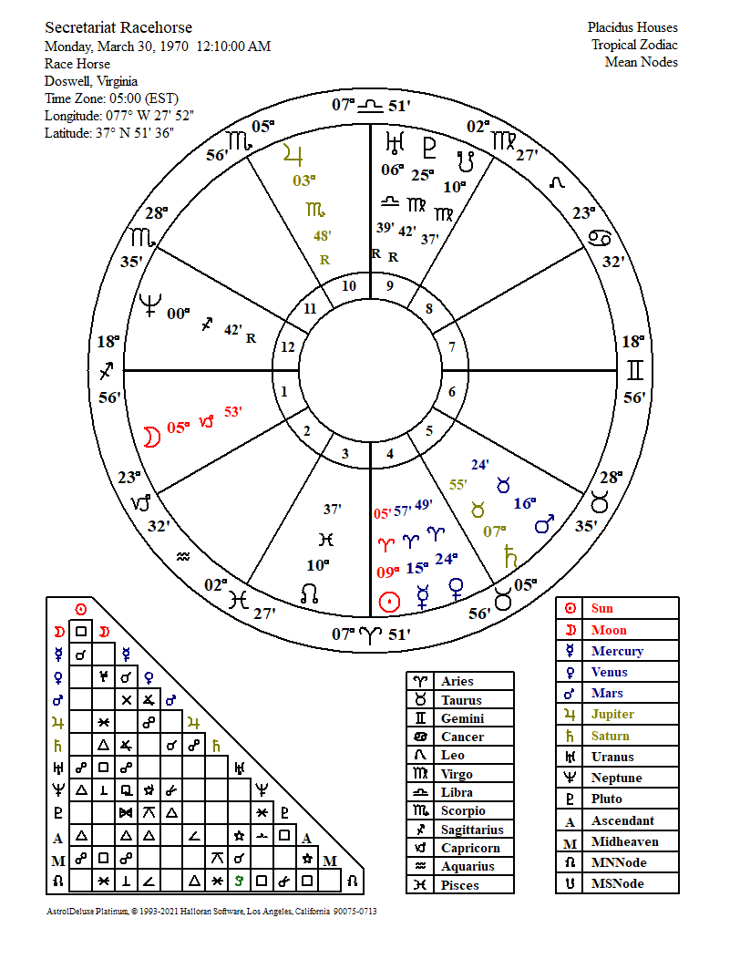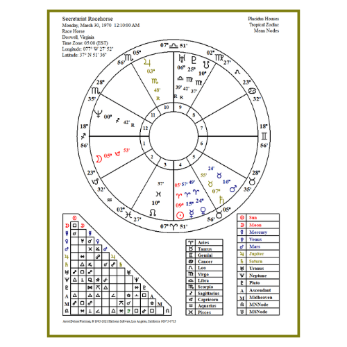 Big Red stood 16 hands tall and ran a 16-month career. His Mars at birth measured 16° Taurus. While his Jupiter at 3° of Scorpio represented the 3 races he would win to claim the Triple Crown in 1970 at 3 years of age with his 3 white feet. His Sun was 9° Aries and he won the Triple Crown on June 9th. He ran the Derby at 1:59 same digits as his Mercurys' measurement in Longitude, 015.95.