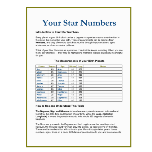 Inside your report, alongside your chart, you’ll receive your unique Star Numbers — the degrees of your planets expressed as patterns that echo through life. These numbers often appear as meaningful dates, ages, or milestones, creating synchronicities that highlight your path. You can use these numbers to your advantage.